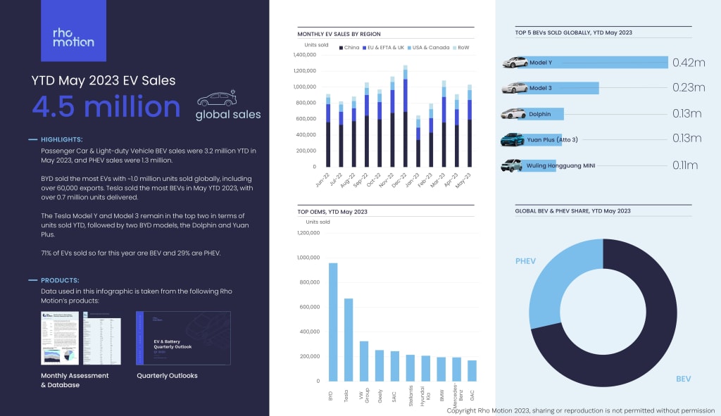 Global EV sales reached 4.5 million units YTD May 2023, growing by 37% compared to the same period last year. Sales in China have grown by 36%, in EU & EFTA & UK by 20%, and in the US & Canada by 59%. The Tesla Model Y and Model 3 continue to lead global BEV sales.
