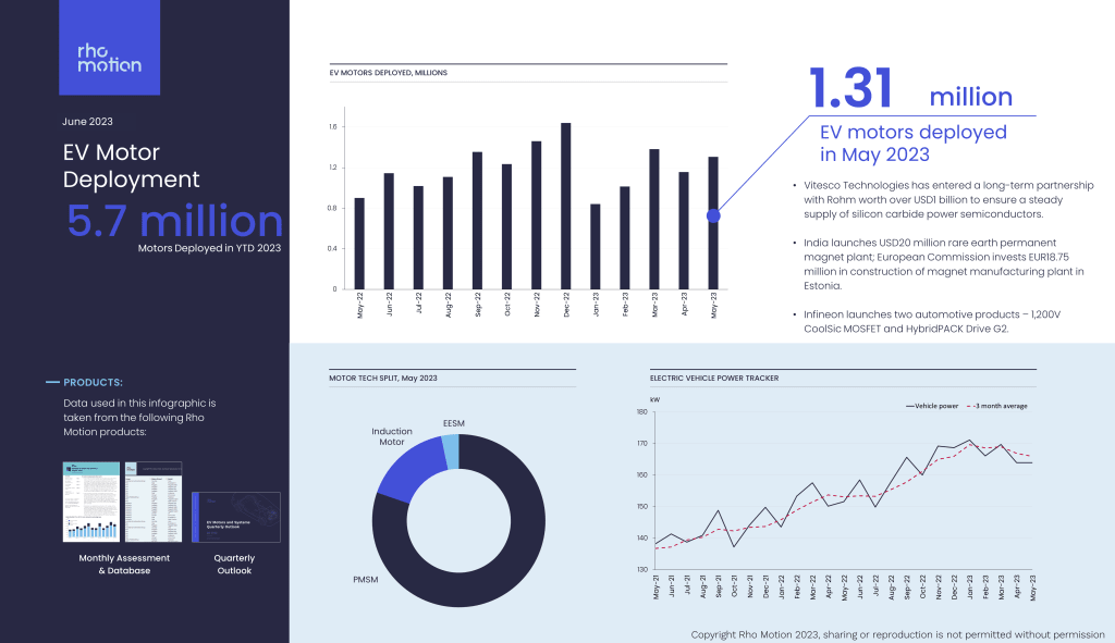 Below is the June 2023 version of our EV Motor Deployment Infographic, which draws on data from our EV Motors Monthly Assessment and our EV Motors and Systems Quarterly Assessment.