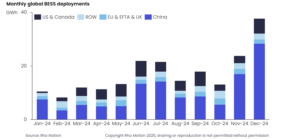 Pete Tillotson, Senior BESS analyst at Rho Motion commented, “Once again China led the way with new deployments in 2024, accounting for over 108GWh of new grid-scale capacity, and 66% year on year growth. Across the total market China’s capacity accounted for 59% of total BESS deployed.”