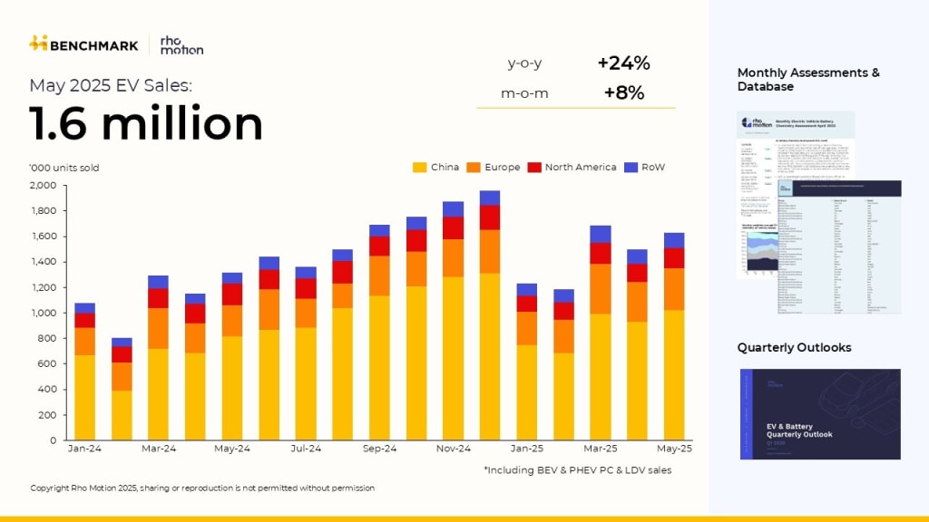 Rho Motion, the leading EV research house, today revealed that the number of electric vehicles sold globally in May 2025 is 1.6 million, with 7.2 million sold year-to-date (YTD). The EV market grew by 24% in May 2025 compared to May 2024, and by 8% compared to April 2025.