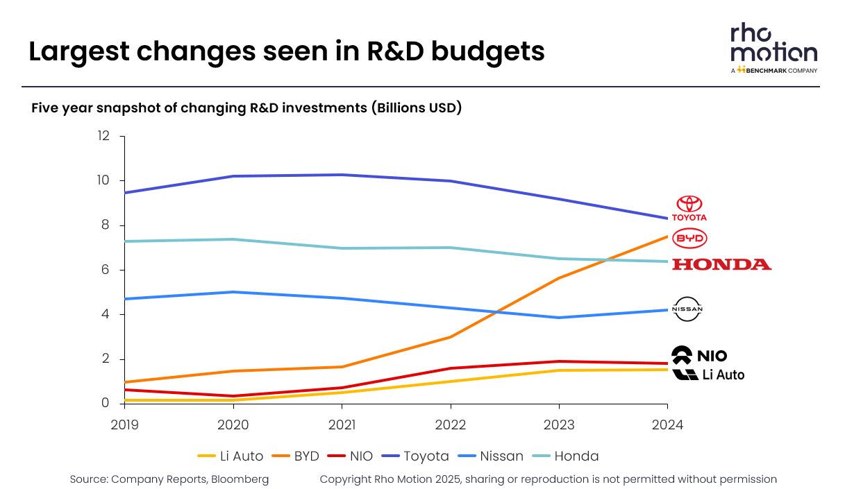 Meanwhile, the top three Japanese automakers—Honda, Nissan, and Toyota—have reduced their R&D budgets in recent years. Although their budgets remain substantial and higher than most other automakers, these players have sustained a strong emphasis on ICE technologies. As a result, EV sales still represent only a small fraction of their overall vehicle sales worldwide.