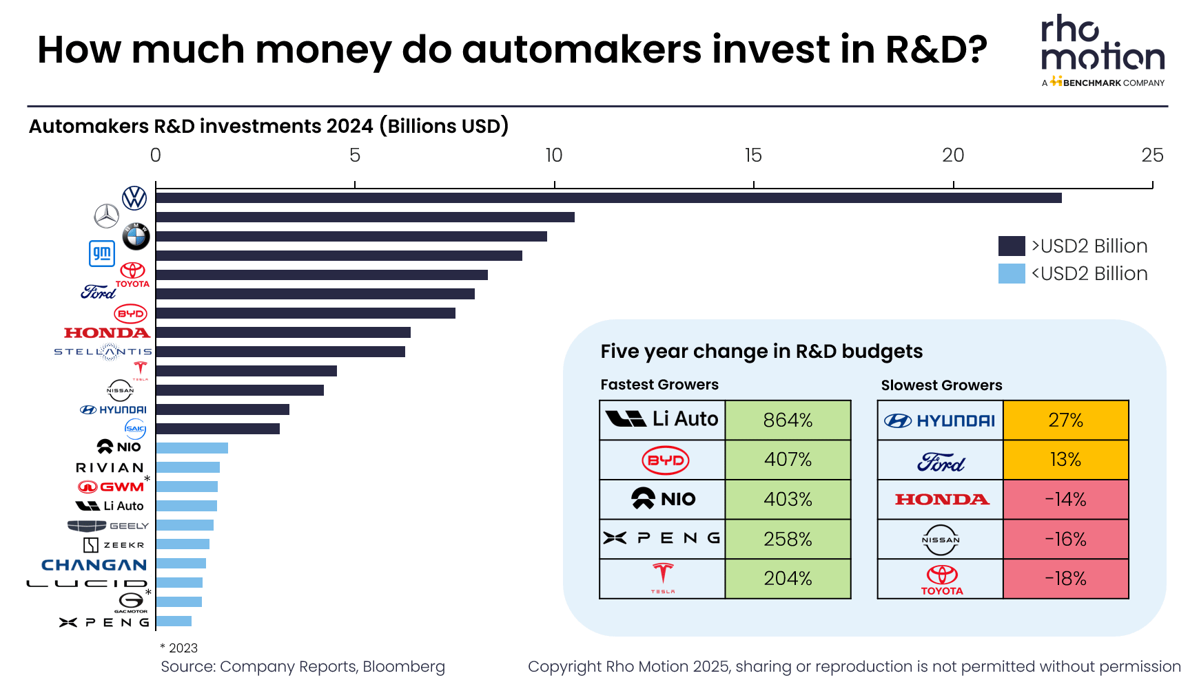 VW is a clear front runner for R&D budget size but when comparing R&D budgets over time, two key trends stand out. First, many Chinese EV manufacturers have significantly increased their investment in recent years, scaling up research efforts in line both with their own growth and the broader expansion of the Chinese EV industry. This reflects a strategic focus on innovation and technological leadership, which has been a hallmark of the Chinese EV market to date.