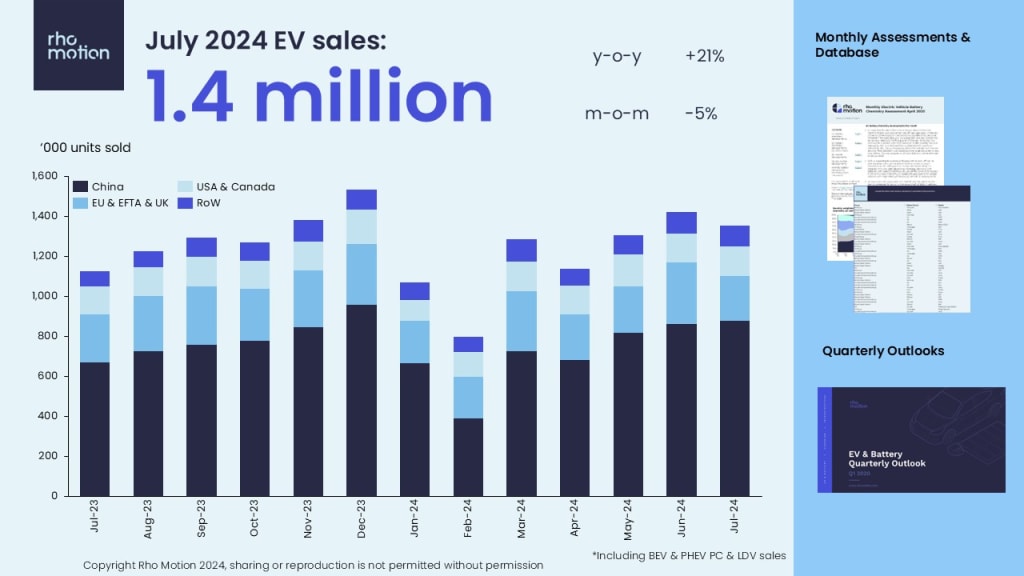Rho Motion, the leading research-house looking at the electric vehicle (EV) market, today revealed that 1.4M EVs were sold globally in July, bringing the year-to-date sales figure up to 8.4 million. Regional disparities continue to grow as EU & EFTA & UK sales fall year on year by 8% compared to July 2023 and China’s market grew by 31%.